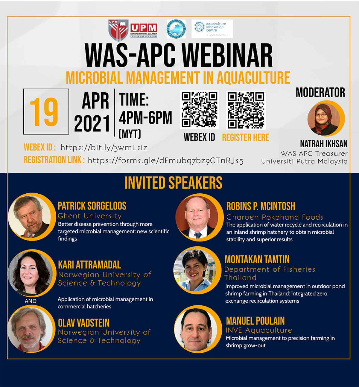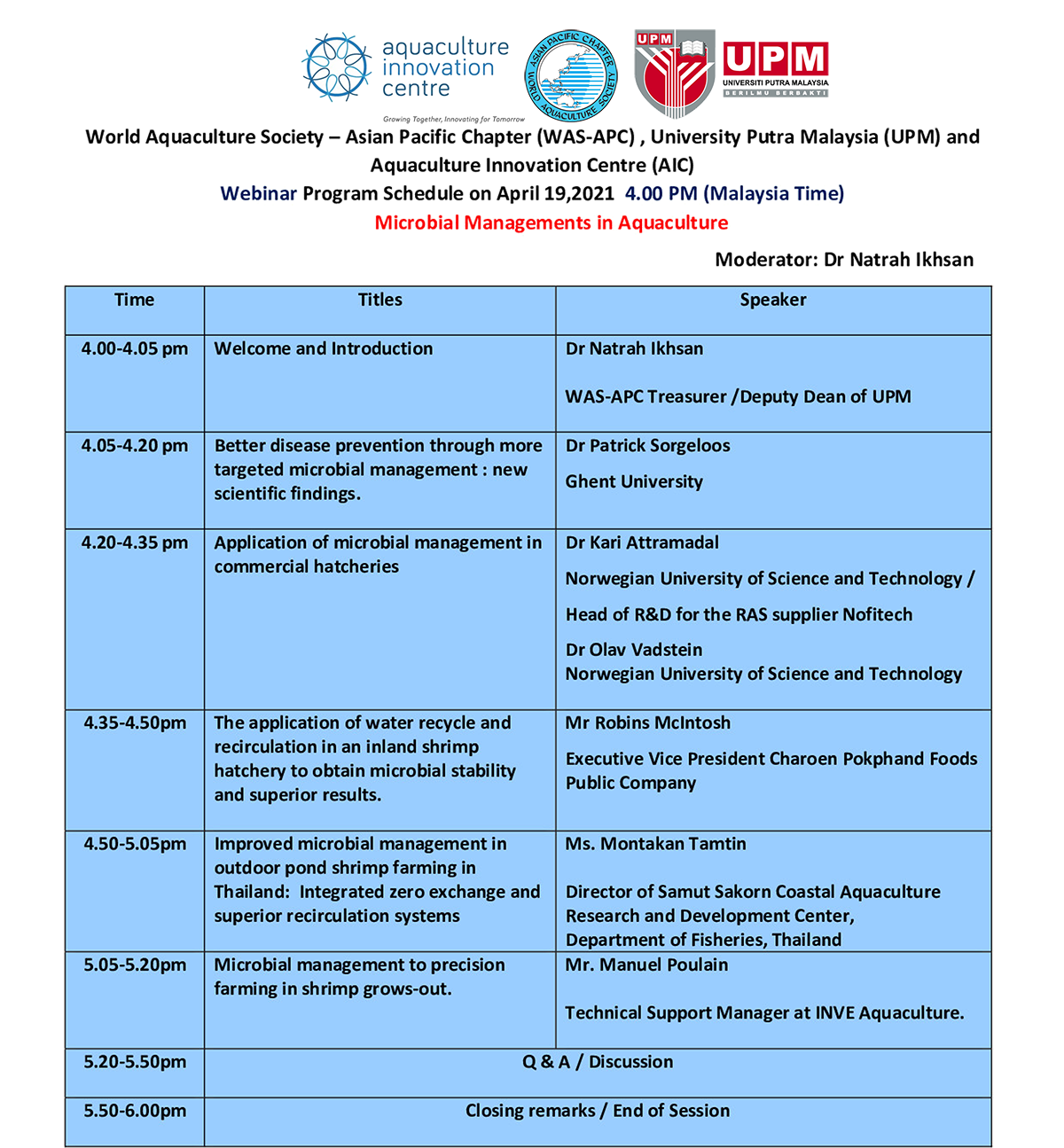 Aquaculture Society – Asian Pacific Chapter (WAS-APC), Universiti Putra Malaysia (UPM) and Aquaculture Innovation Centre (AIC) will hold a webinar on “Microbial Managements in Aquaculture” on 19th April 2021 (4:00 pm Malaysia Time, GMT+08:00).